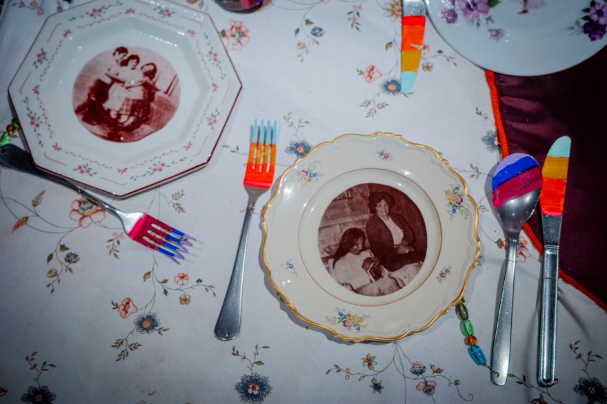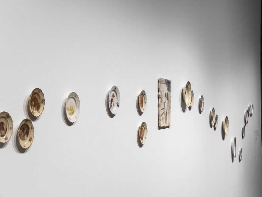 - La instalación de platos de cerámica derivada de mi proyecto Fiestas Funerarias (2011), desarrollada para este proyecto con el archivo familiar de Valeria Montti.