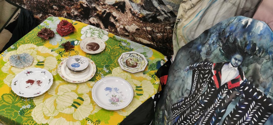 For Cosmonación, I worked with the family archive of Valeria Montti Colque, scanning Polaroids and handwritten notes from her family’s early years of exile from Chile to Sweden. I selected and edited these images—together with digital materials—and designed ceramic decals. I researched the transfer process in collaboration with colleagues specializing in glass techniques and with a ceramist from Väckelsång, who is an expert in the procedure. By firing the decals in monochrome and fusing the images with the original textures and colors of the pre-existing ceramic plates, the work generated layered narratives of history, materiality, and affect. - La Vamperra: a character introduced within the textile collage Mamita Montaña and activated during the performance at the Venice finissage.