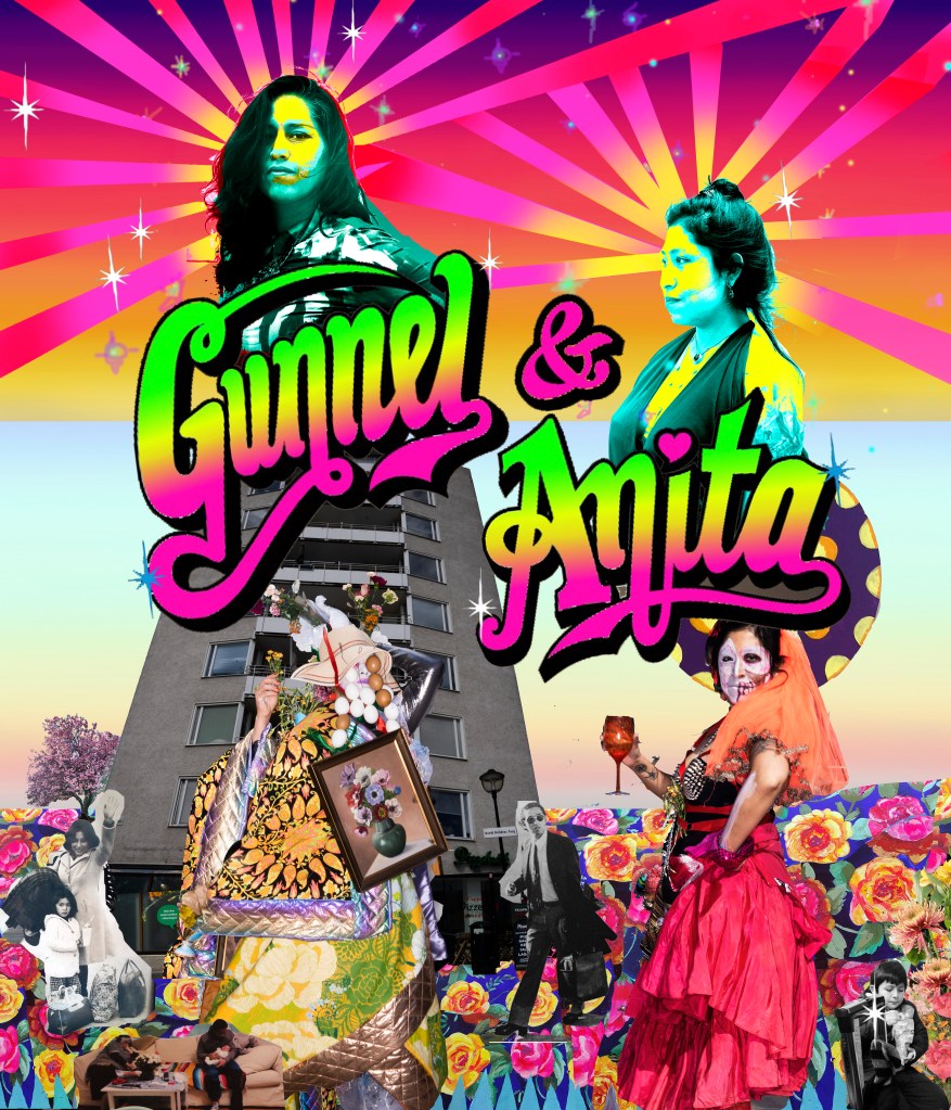 La Vamperra embodies a hybrid force between the festive and the funereal. Inspired by personal memories, popular culture, and Andean lineages, the character inhabits collages, embroidery, lettering, performances, video, and other actions. Its symbols—red goblets, skulls, rituals—refer to migration, mourning, and celebration as forms of resistance and community. The photograph used in the collage was taken by José Figueroa for the duo exhibition with Montti Colque, Gunnel & Anita (BAS Konsthall, 2022, curated by Ashik Zaman). Since then, the character has reappeared in Montti Colque’s work: in the digital collage and video installation Himlajorden på Picnic (Region Stockholm, metro stations Zinkensdamm and Skanstull, 2022–2023), and more recently in Mamita Montaña, included in Cosmonación.