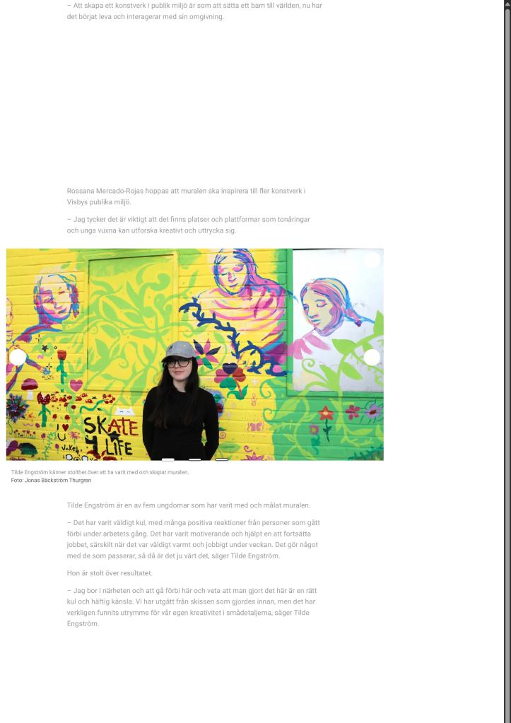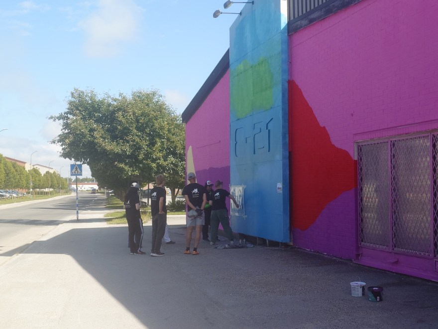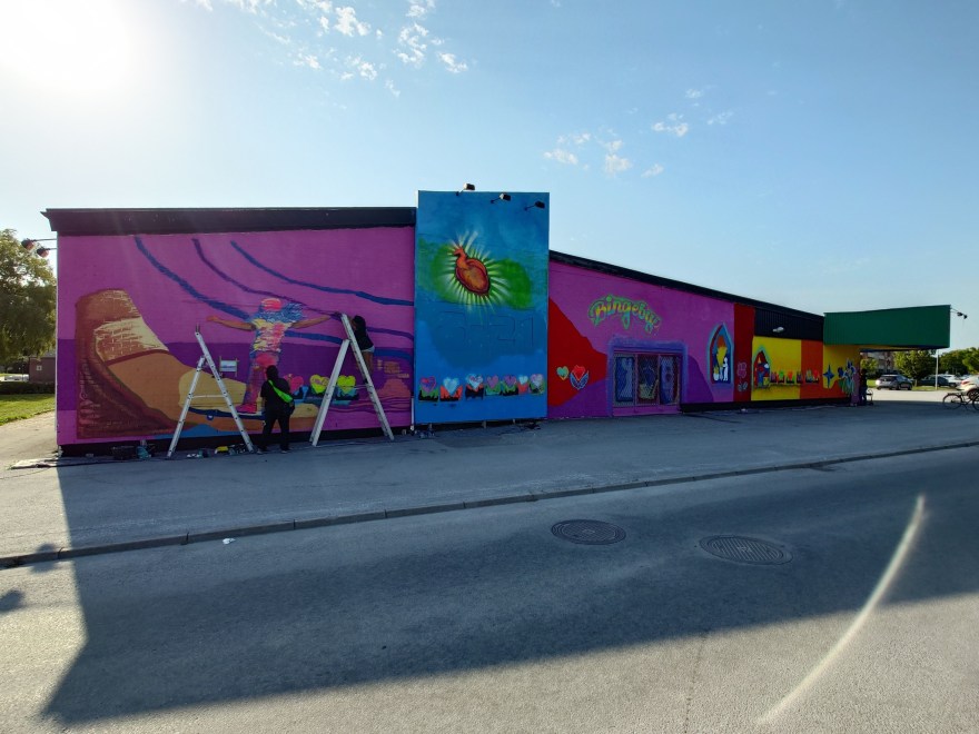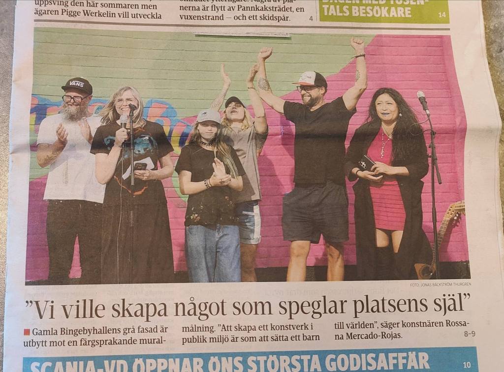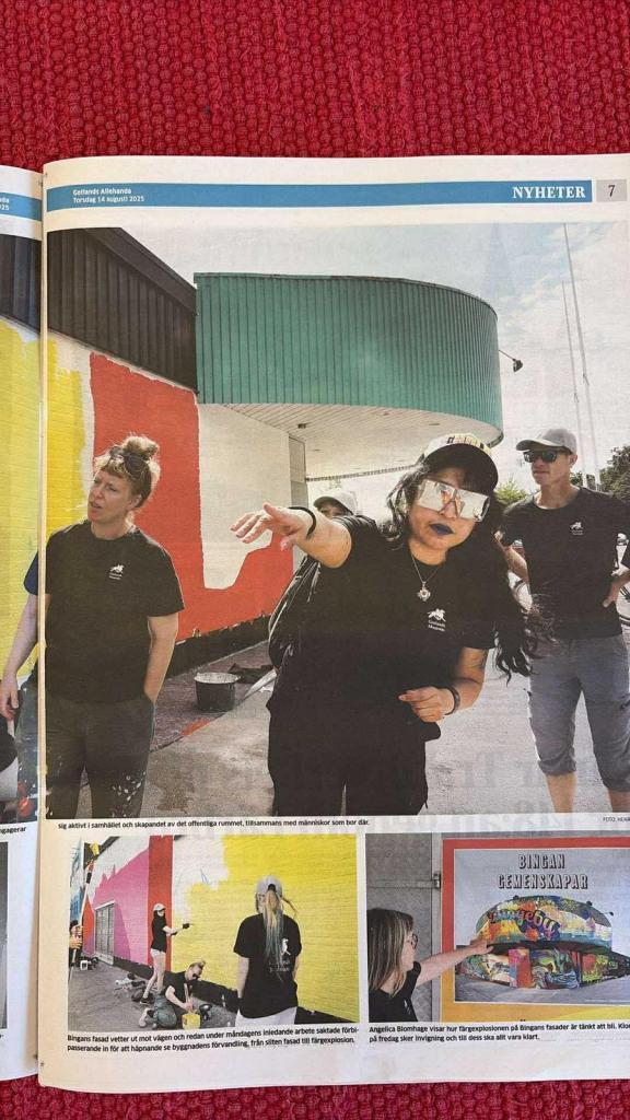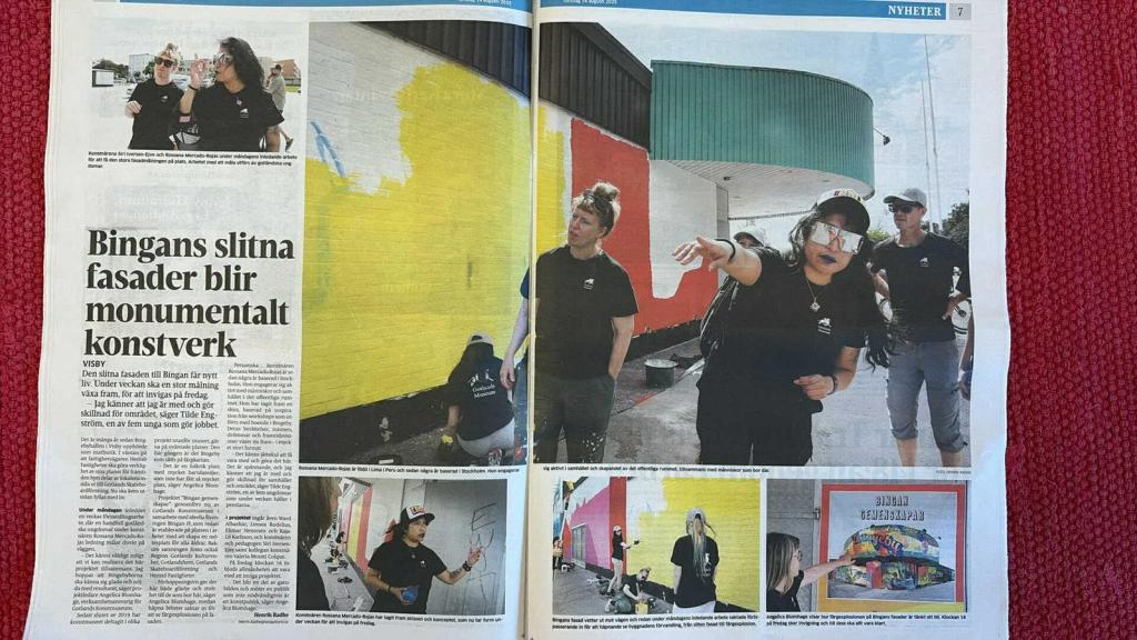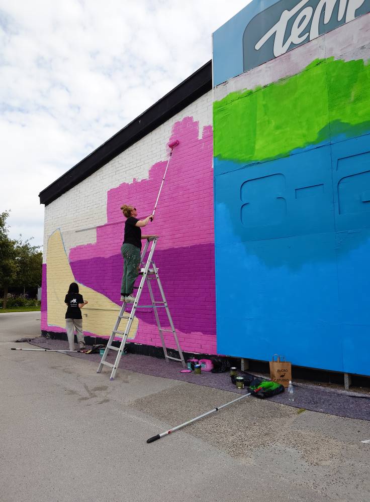 A new mural that I sketched in dialogue with residents of Bingeby was realized with the amazing team consisting of Siri Iversen-Ejve, whose background in painting and pedagogy was key in training the young team, technically, logistically, and artistically. Likewise, Sarai Alvarez Riveros, artist and expert in monumental projects, who has worked with me as a sister muralist since I moved to Sweden, along with a young practicant team: Ward Albashar, Linnea Rudelius, Elimar Nenonen, Tilde Engström, and KajaLii Karlsson, All of them and their expertise, hands-on work, and commitment were crucial to completing this mural within a week.