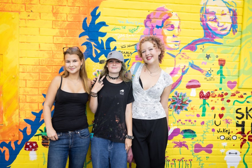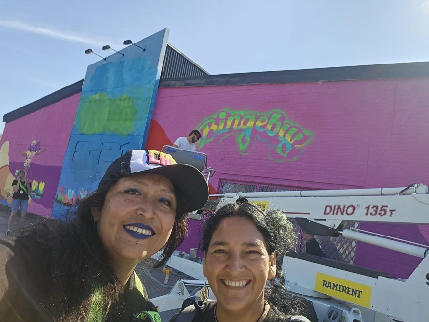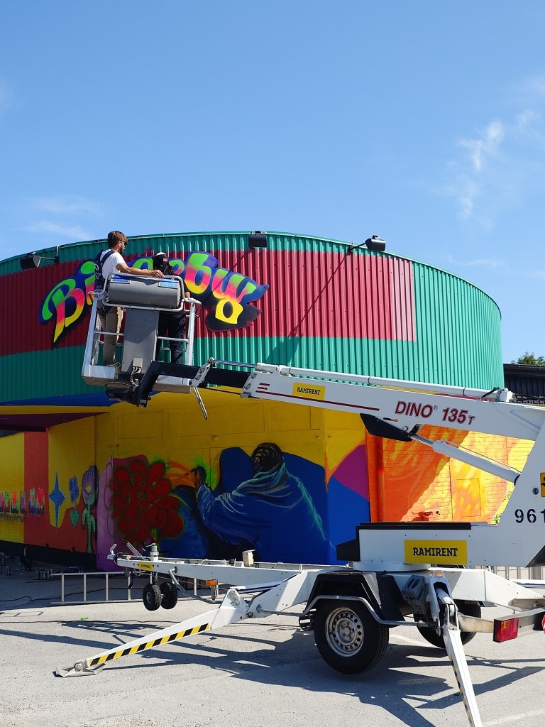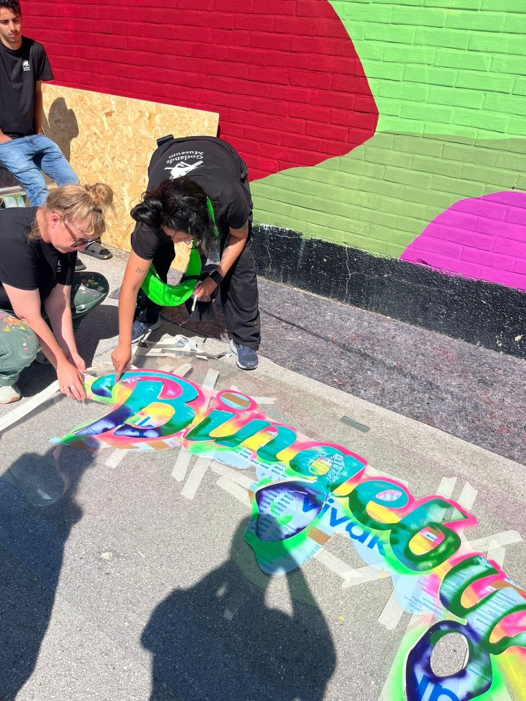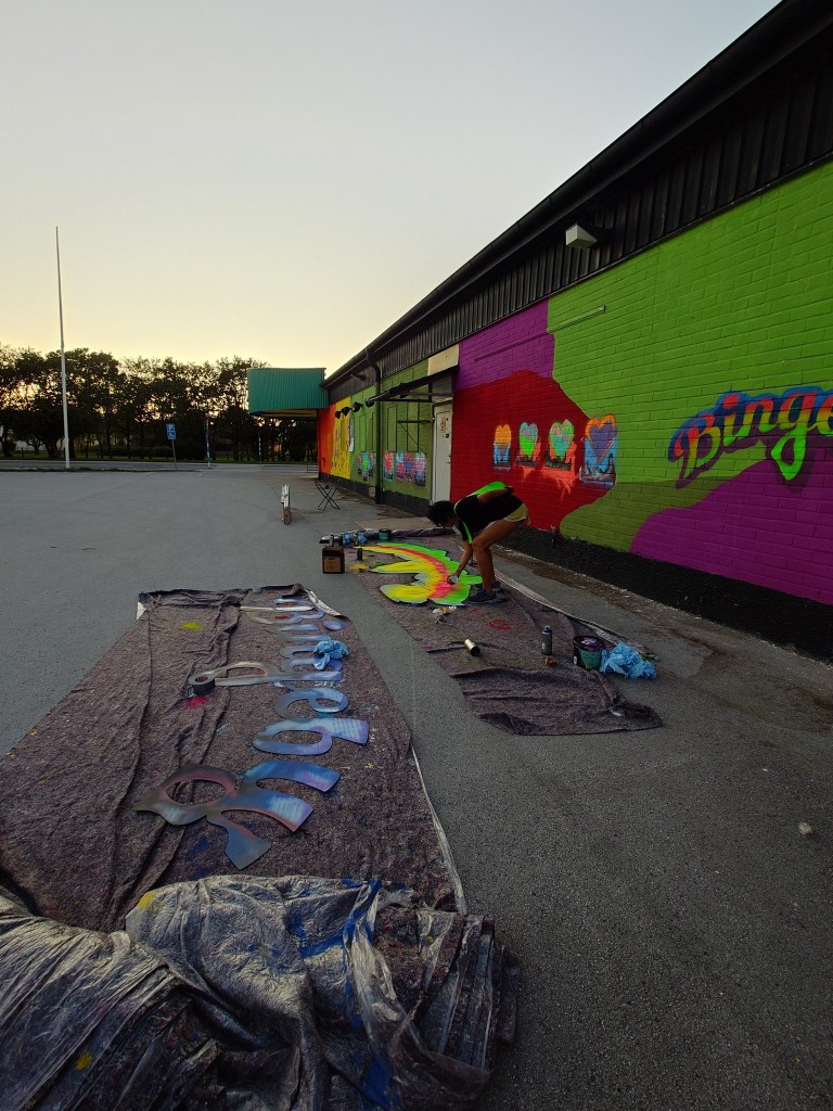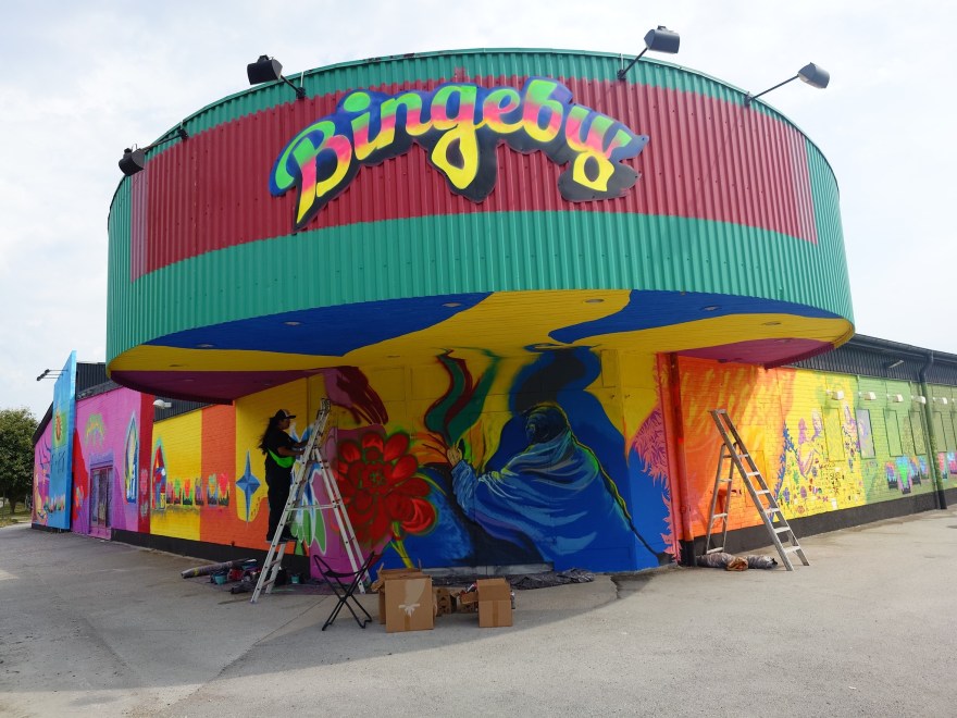 A new mural that I sketched in dialogue with residents of Bingeby was realized with the amazing team consisting of Siri Iversen-Ejve, whose background in painting and pedagogy was key in training the young team, technically, logistically, and artistically. Likewise, Sarai Alvarez Riveros, artist and expert in monumental projects, who has worked with me as a sister muralist since I moved to Sweden, along with a young practicant team: Ward Albashar, Linnea Rudelius, Elimar Nenonen, Tilde Engström, and KajaLii Karlsson, All of them and their expertise, hands-on work, and commitment were crucial to completing this mural within a week.
