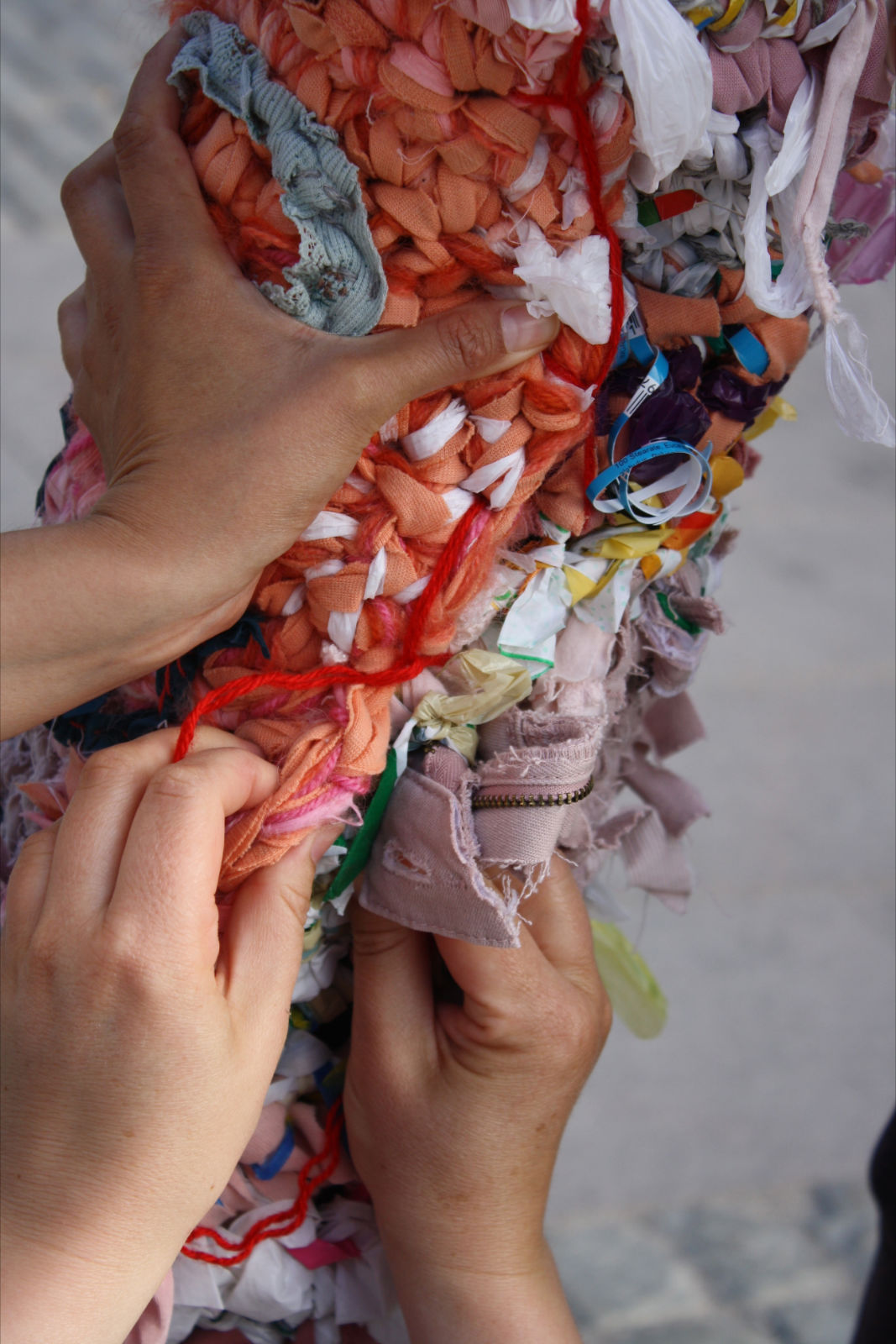 The groups started web-based dialogues were they find each other´s field of expertise to be complementary for this project: Stickkontakt´s long experience in taking knitting out of its domestic sphere in the form of craftivism and street art around different spaces in Stockholm and C.H.O.L.O’s input regards their various earlier participatory projects that investigate the relations between community, art and identity in Lima. The discussions covered topics such as participatory events, socially engaged art and methodology resulting in two different approaches to the use of textiles in the public space in their own cities. “Tapestry of collective memory” in Peru, is a communitarian workshop that took place in Ventanilla, one of the biggest districts in Lima where one third of the population lives in shanty towns. This tapestry and its configuration can be seen as an empowering tool that directly constructs the local landscape. Stickkontakt’s interest in engaging into collective projects was materialized in the form of experimental “open projects” where the group worked with participation of people other than the members; “Stripped down, shut off” is collective knitting for demonstration against public health recent reforms. Both groups used recycled items in order to play metaphorically with the revalidation and reconfiguration of the individual when participating in different activities.