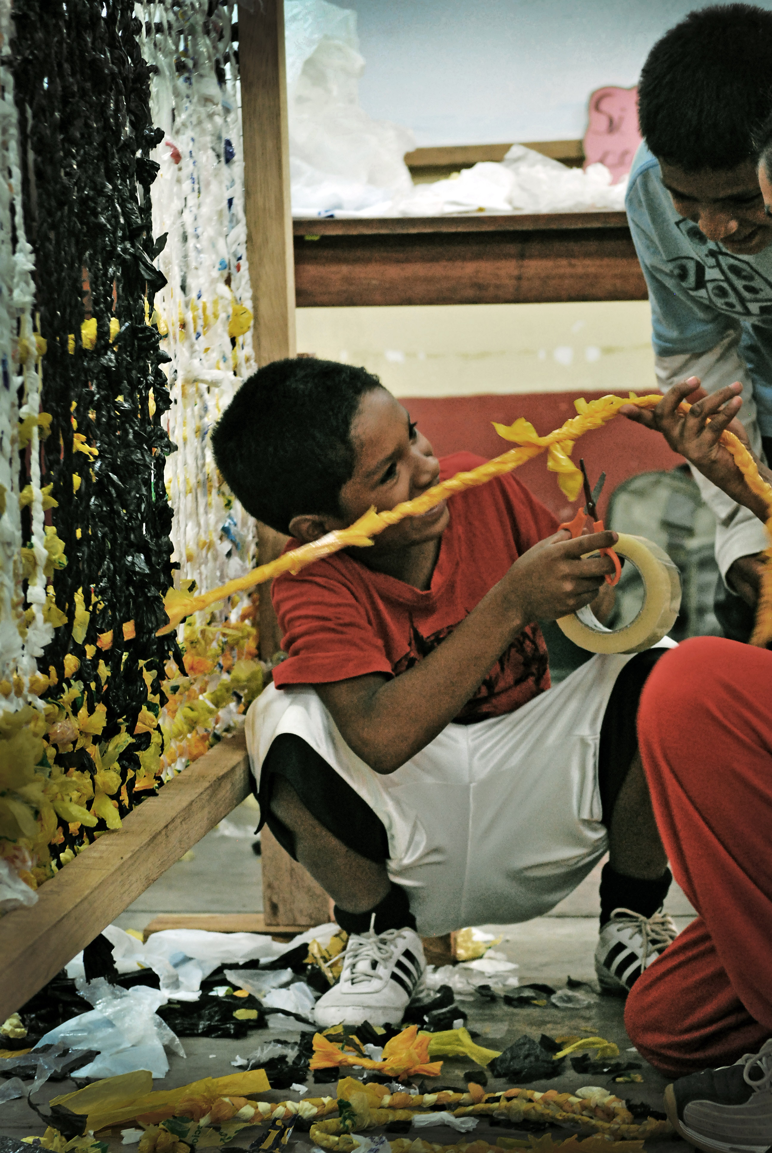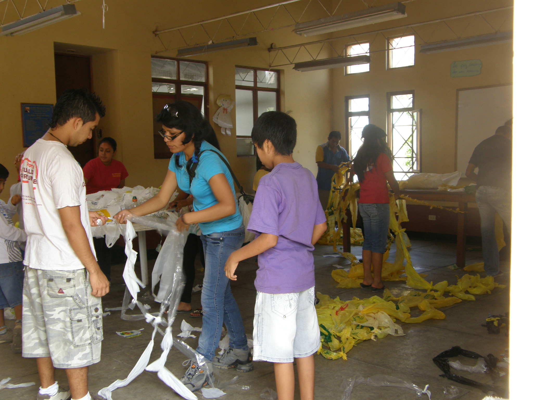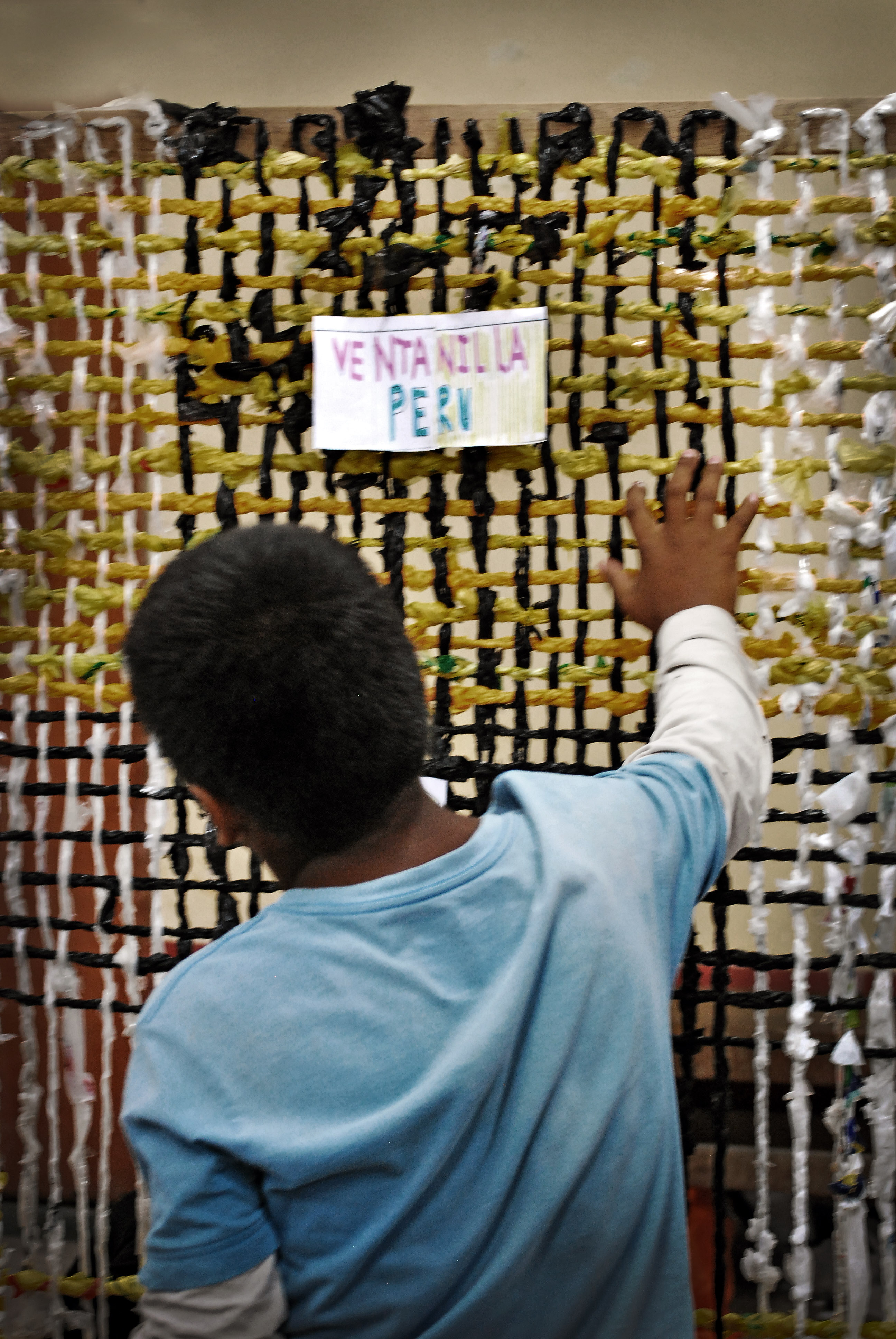 For this project the collective worked with associations in Ventanilla, that usually gather together in order to perform collective work to improve the quality of life in their community, so they could create “Collective Memory tapestry” (Tapiz de la memoria colectiva), a four piece tapestry with designs from the everyday life in Ventanilla that they wove using recycled plastic bags. The idea is to take recycled bags as a symbolic product of our current state of “modernity” in Lima. Knitting with the most abundant and disposable material in contemporary societies means knitting a present memory that could become a document of our time. This event took place on May 1rst at the shanty town “Hijos de Grau” in the district of Ventanilla with the participation of the community and invited artists that work around the subject of public art and collectivity. C.H.O.L.O aims to analyze the relations between art, community and identity from “the emergent perspective”.